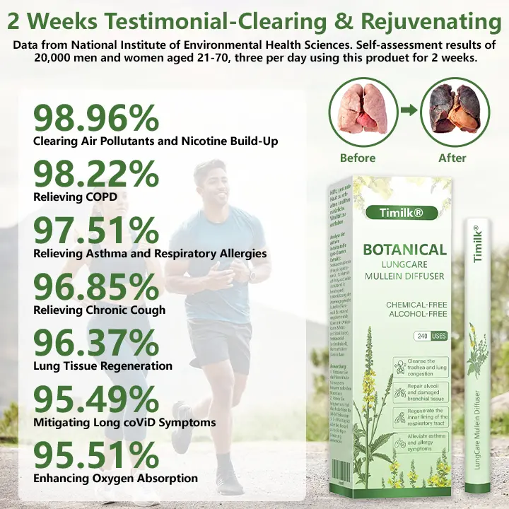 A a veszélyes légszennyezésnek kitett emberek 99%-a miatt a légzéstámogatás soha nem volt ennyire nélkülözhetetlen. Ha Ön korábbi dohányos és még mindig küzd a tartó köhögéssel, vagy elefáradt a költséges megoldásokba, amelyek nem ígértek mindent egyedül. A legtöbb ember több százat pazarol olyan termékekre, amelyek alig működnek, mert a rossz kézbesítési mechanizmusra támaszkodnak. De mi van akkor, ha van egy alclinically működő megközelítés, amely a klinikai adatokon spirálisan működik data-start=”525″>2 perc 90 perc helyett? A Timilk® Botanical LungCare Mullein Diffuser fejlett orr-inhalációs technológiája a koncentrált ökörfarkkóró kivonatot közvetlenül a légzőrendszerbe juttatja 2 percen belül — teljes egészében és oda éri el a tüdejét, ahol a legnagyobb szüksége van rá.